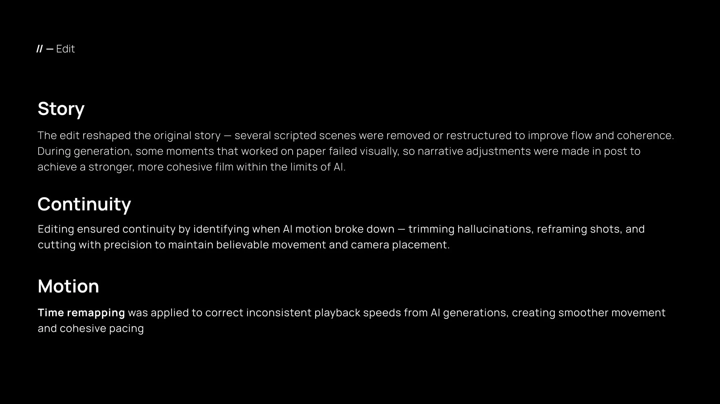 We treat AI footage like any other raw material. Editing, sound, color—we apply cinematic post workflows to elevate generated content into a polished piece that holds up to professional standards.